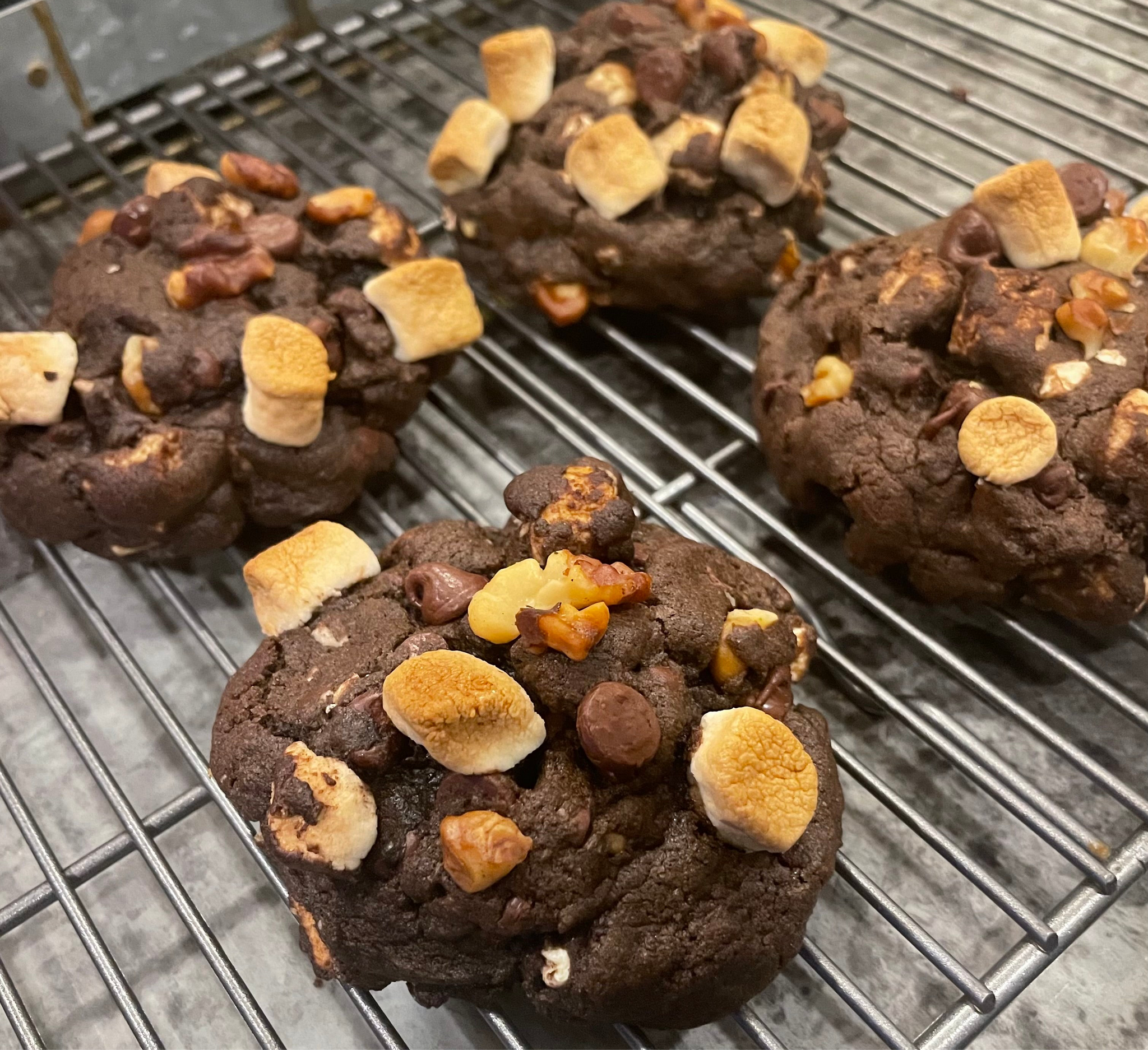 Thick and delicious soft chewy rocky road inspired cookies made with melty and toasted marshmallows, chocolate chips, and walnuts. Don’t worry! These don’t melt!