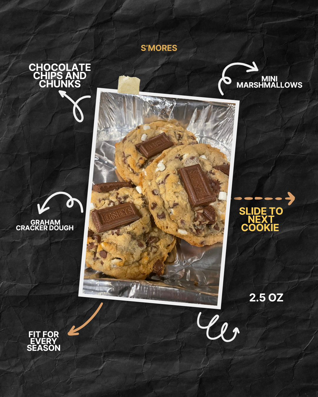 S’mores- Graham cracker chocolate chip cookie base meets mini marshmallows and chocolate chunks.