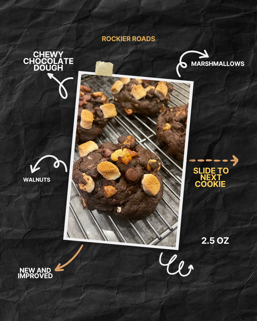 Rockier Road- thick and chewy icecream flavor inspired cookie. Fudgy chocolate cookie with marshmallows, chocolate chips and walnuts.