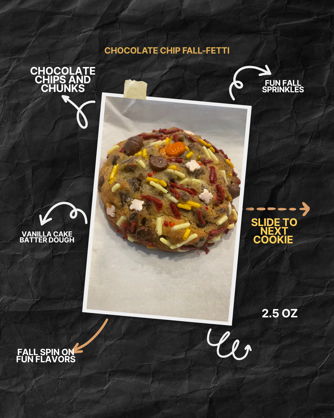 Chocolate Chip Fall-Fetti- Vanilla chocolate chip cookie with fall sprinkles