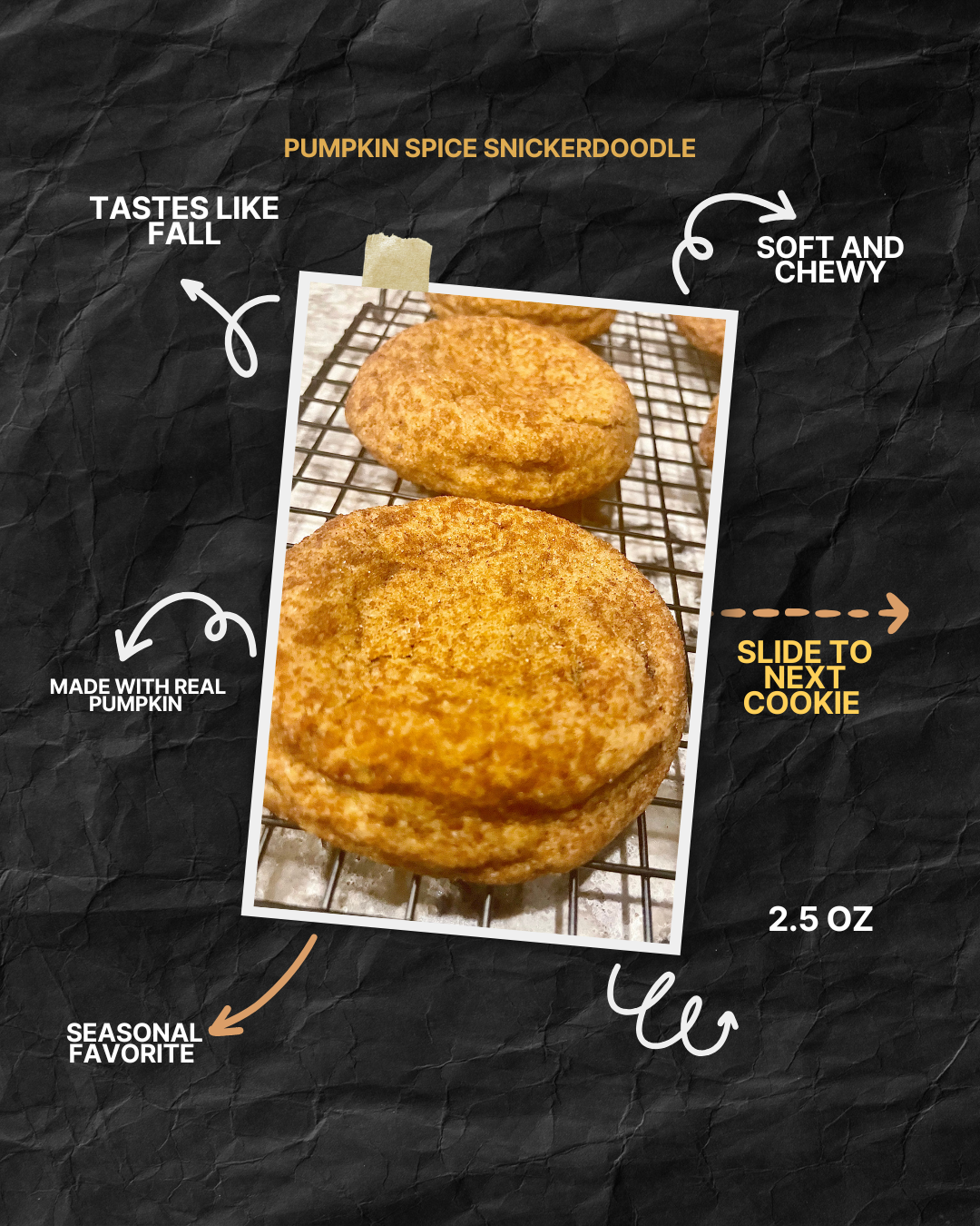 The best opportunity to try a variety of goods at once! Customer favorites meet seasonal sweets and new cookies by the 1/2 or whole dozen. Get 1 of each cookie (1/2 dozen) or double it and get 2 of each (half dozen). Each cookie is roughly 2.5 oz and made to order.