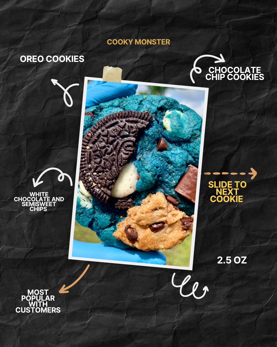 Cooky Monster- Customer favorite cookie made with a blend of white chocolate chips, chocolate chunks, Oreo and chocolate chip cookie bits.